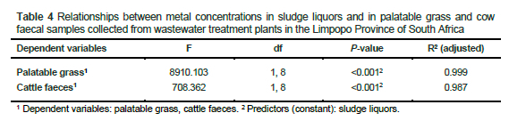 It is important to note the pattern of heavy metal concentrations in the sludge liquor, plant, and cattle faecal samples from WWTP2 (Figure 2 and Table 4). As depicted in Figure 2 and confirmed in Table 4, a similar pattern/trend can be noted in the concentrations of the heavy metals in the three different media. The results of the linear regression analysis suggest that the concentrations of the heavy metals in the sludge liquors have a significant relationship with the concentrations of these metals in the palatable grass and cow faecal samples.
