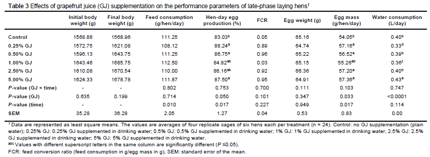 The composition of the grapefruit juice used in this study is shown in Table 2, and the effects of the grapefruit juice supplementation on the hens' performance parameters are shown in Table 3.