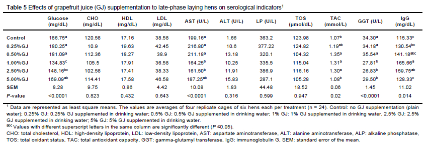The effects of grapefruit juice supplementation on the different serological indicators are shown in Table 5.