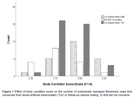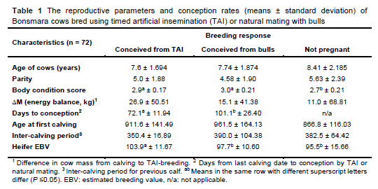 The pooled conception rate of the Bonsmara cows from both TAI and follow-up natural mating for the three-month breeding season was 76.7 ± 0.05%. The BCSs of the cows that conceived from TAI and follow-up natural mating were higher (P <0.05) than those of the cows that did not conceive. The ΔΜ values of the cows that conceived were not statistically higher than those of cows that did not conceive from TAI. The ages and parities of cows with different pregnancy statuses did not differ.