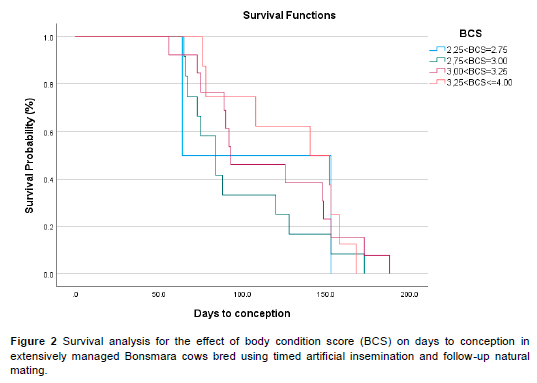 Data were captured in Microsoft Excel, followed by the calculation of frequencies and descriptive statistics. Initial analyses of the effects of ΔΜ, BCS, and time-of-TAI on conception rates from TAI, pooled conception rates from TAI and natural mating, and other variables were analysed using multifactorial general linear analysis of variance in SAS version 13, and by a multinomial generalised logistic regression function (Rasby, 2007; Washaya et al., 2019). As slight (non-significant) differences in cow age were observed between the BCS categories, the statistical models included cow age as a covariate. Differences between means were tested using Bonferroni's multiple range test at a 95% significance level (P <0.05), which accommodates the unbalanced data due to missing values. Conception rates over the breeding season (including TAI and natural service by bulls) were also analysed using survival analysis of the number of days postpartum (from previous calving to TAI), as influenced by BCS and breeding outcome (conception by TAI or natural mating, or not pregnant), as previously described by Escrivao et al. (2012) and Short et al. (1990).