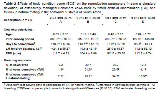 The results of this study indicate that BCS affects the conception rates of Bonsmara cows in the Limpopo Province of South Africa when they are bred using a combination of TAI and follow-up natural mating with bulls. This is significant as it shows that an acceptable BCS is important for breeding cows, even if the cows are synchronised in oestrus and inseminated at the recommended time post-synchronisation. Cow BCS had a more significant effect than ΔΜ, as ΔΜ had a numerical but not statistically significant impact on conception rates. These findings generally agree with those of Esposito et al. (2014) for dairy cows, and highlight the importance of maintaining the preferred BCSs of 3.0 to 4.0 to achieve the best conception rates in extensively managed beef cows. Cows with higher BCSs had a greater probability of conception until a threshold BCS of approximately 4.0, after which conception rates decreased. This confirms that nutrition, especially the accumulation of energy reserves during the periparturient period, influences the reconception of extensively managed beef cows. Heifer EBVs were higher for cows that conceived from TAI than for those that conceived from follow-up natural mating or that did not conceive at all.