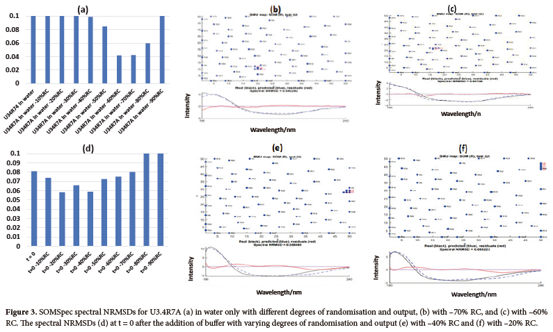This work explores whether the ad hoc approach, systematically automated when complemented with self-organizing map spectroscopy, SOMSpec, is useful for the analysis of heterogeneous peptide populations. 19-21 It further discusses how the extent of derandomisation on the spectra of three U3.x peptides and their seventh position alanine variants in water and after the addition of buffer over time affects the overall goodness of fit of the structure and spectral output from SOMSpec.