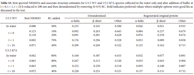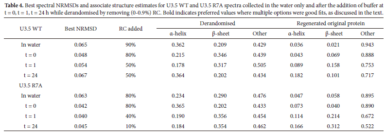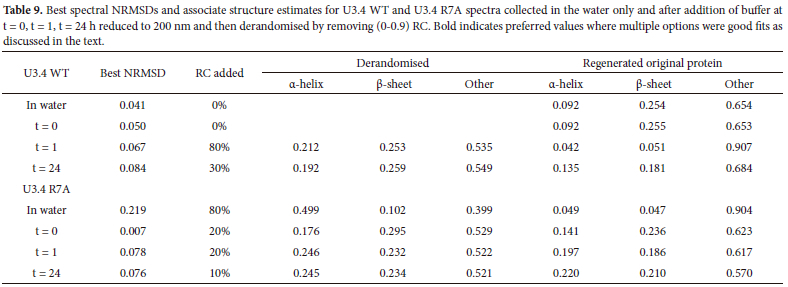The best fits for U3.5 WT in water only and at 24 h of adding buffer have the same extent of derandomisation, however, the structure estimates for a-helix and β-sheet differ by 10.6% and 56%, respectively. There is a significant drop in the extent of derandomisation required for best fit immediately after the addition of a buffer but a slight fall to -50%RC was observed at 1 h. Though the spectral trends for U3.5 R7A were similar to that of U3.5 WT, its extent of derandomisation for best fit immediately after the addition of a buffer dropped and further dropped at 1 h and 24 h, respectively to -30%RC and 0%RC. We observed its β-sheet content increased over time after adding a buffer to 34.5% at t = 24 h (Table 7). Twenty-six of the forty spectra of U3.5 WT down to 195 nm showed improvement in their quality and estimate of secondary structure when compared to original data, whereas overall data down to 200 nm were worst. The behaviour of U3.5 R7A spectra down to 195 nm was similar to the case of its U3.5 WT when compared to original data and that down to 200 nm (Table S2).