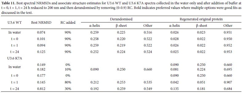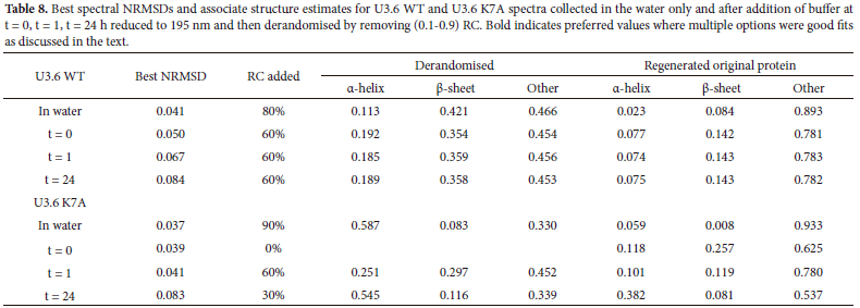 All the best fits for U3.6 WT explored are associated with the same extent of derandomisation (which is of a higher fraction) and the same structure estimates for each element. For 3.6 K7A, two of the four conditions explored behaviour is similar to that of the WT. They have the same higher extent of derandomisation associated with the best fits and the same structure estimates for each element. Though in water only two similar lowest NRMSDs were observed at first, and then the best choice was determined to be with -0%RC. Later at t = 1 h the associated extent of derandomisation to the best fit markedly increased to -80%RC and then at t = 24 h significantly dropped to -30%RC. The latter case gives rise to 13.5% a-helix and 18.1% β-sheet which are respectively higher than the corresponding estimates for the former at t = 1 h by 221.43% and 260.78% (Table 11). Overall, as the percentage of derandomisation increases there is a gradual decrease in the four structure elements, viz., helix, sheet, bend and turn (Figure S35 and S36).
