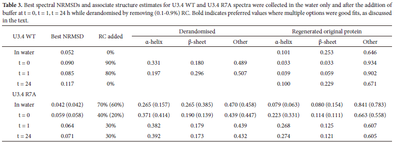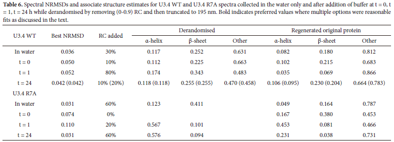 Assessment of the best options for these peptides was carried out using mainly their NRMSD values, except for two instances. Table 3 shows the best spectral NRMSDs and their associate structure estimates for an aqueous solution of U3.4 WT and U3.4 R7A only, after adding buffer, and subtracting (0.1-0.9) RC from the spectra. Almost all of the best choices of these peptides are obvious except for U3.4 R7A in water only with -60% RC and -70% RC, and at t = 0 h (immediately after adding buffer) with -20% RC and -40% RC. Though the NRMSDs were almost the same for the two options at each condition, the best choices were found to be -70% RC and -40% RC respectively before the addition of buffer and afterward, at t = 0 h (Figure 3b,c,e, and f) based on spectrum shapes match. Alternatively, the best choice can be decided without necessarily inspecting the spectra by implementing a refinement with the percentage RC between the two observed options (lowest and very similar NRMSDs). There is a clear indication that at t = 1 and 24 h the same extent of derandomisation (-30%RC) gives best fits with similar structure estimates.