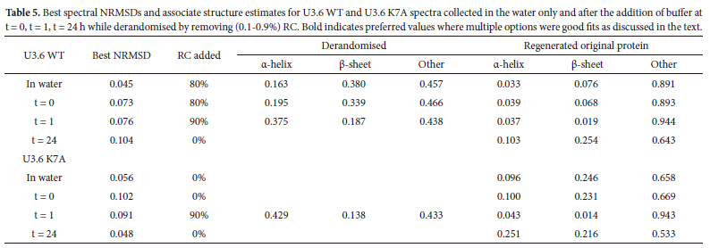 Table 6 displays the best NRMSDs and their structure estimates and percentage derandomisation added to U3.4 WT and its mutant spectra truncated to 195 nm that effect best fits. The best fit for U3.4 WT in water only has a lower extent of derandomisation (-30%RC) and its NRMSD value (less 0.05), suggests the structure estimates and fitted spectral are of reasonable fit. This resulted in 8.2% a-helix and 18% β-sheet. Immediately after adding the buffer to the peptide solution, the extent of derandomisation associated with the best fit dropped to -10%RC, to give 10.2% a-helix and 21.5% β-sheet. At t = 1 h, the extent of derandomisation associated with the best fit rose to 80%RC, expectedly with a drop of about 68% for both a-helix and a-sheet compared to previous condition's estimates. Two similar lowest NRMSDs were observed at t = 24 h; and the best choice was determined to be with -10%RC following the approach used in the previous occurrence. Therefore, the estimates for both a-helix and β-sheet appreciate by 203% and 232% respectively. We recognised for the mutant that its extent of derandomisation that caused the best fit, dropped immediately after adding the buffer and later rose moderately at 1 h and at the end of the reading rose back to the initial value (-60%RC). It appears that spectra whose best fits have no or lower derandomisation contain more folded structures than those with a higher degree of derandomisation. For example, at t =1 h after adding buffer the estimates for a-helix rose by 171.26%.