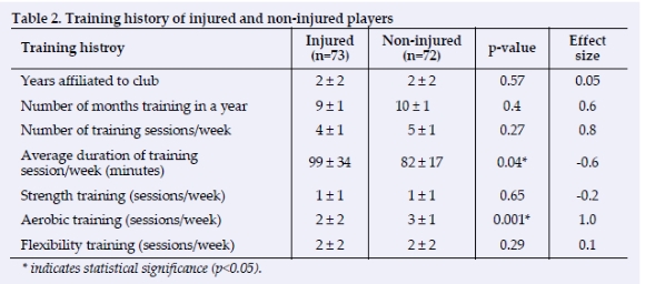 The training history profile of the non-injured players differed from the injured players in regard to the average duration of a training session per week and the frequency of aerobic training practice (p<0.05). Aerobic training involved running. The injured players' average training session duration was significantly longer than the non-injured players (p=0.04) (Table 2). The non-injured players performed more aerobic training per week than the injured players (p=0.001) (Table 2).