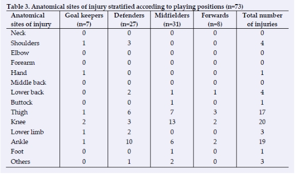 There were 73 injured (50%) of the 145 participants (X2 =0.9). The point prevalence injury rate for the six months prior to the evaluation date was 0.000365 per player. Most vulnerable anatomical sites of injury included knee (27%), ankle (26%), thigh (23%), shoulder (5.4%), lower back (5.4%), lower limb (4.1%), groin (2.7%), hand (1.3%), buttock (1.3%), foot (1.3%), and head (1.3%) (X2=0.00001) (Table 3). Type of injury sustained by the participants included muscle injury (29%), joint injury (27%), ligament injury (13%), nerve injury (3.4%), bone injury (1.7%) and unexplained injury (24%) (X2=0.0001). Number of day/s participants missed practice and/or games: one day (10 participants), two days (11 participants), three days (1 participant), four days (3 participants), five days (9 participants), more than five days (24 participants) (X2=0.0008). The choice of healthcare practitioners that the injured participants consulted when sustaining their injury included physiotherapists (26 participants), general practitioners (17 participants), orthopaedic surgeons (10 participants), biokineticists (7 participants), massage therapists (3 participants), chiropractor therapist (0) and others not identified (one participant) (X2 =0.000001). Fifty participants (68%) of the 73 injured players practised and/or played through the injury (X2 =0.0009). Of the 50 injured participants who practised and/or played through the injury, 22 participants' (44%) pain symptoms increased (X2 =0.3). Of the 17 goalkeepers, seven were injured (41%), 27 of 40 defenders were injured (67%), 31 of 72 mid-fielders were injured (43%), and eight out of 16 forwards were injured (50%) (Table 3).