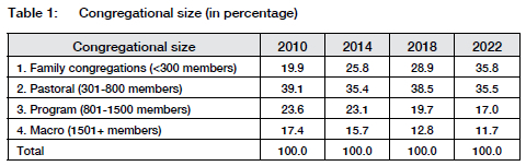 The previous section illustrated the complexity of congregational culture. The dynamics of society and an ever-changing environment challenge congregations to adapt, and they should be continuously seeking contextual relevance. The variations in congregational size may assist in understanding a changing congregational culture. The size of a congregation may be used as a theoretical framework to explain some of the differences within congregations (see Johnson 2001, for example). The size of a congregation influences its capacity and ability to perform certain tasks, minister to its members, and serve the community. The size of a congregation also influences the quality of relationships and the role of the leadership.