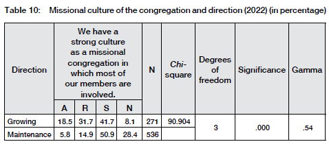 The gamma value explains 53% of the variance in the table; it increased from 2018 to 2022, indicating a rise in the role that a missional orientation plays in a movement from maintenance to growth within a congregation. The argument is supported by Tables 9 and 10, which indicate that larger congregations (programme and macro) and growing congregations have stronger missional cultures.