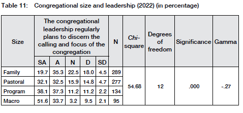 The data indicates that the congregational leadership did not improve between 2018 and 2022 in the strategic role they could have played (Table 6). The congregational leadership of the programme and macro congregation plans regularly to discern the calling and focus of the congregation. In contrast, family and pastoral congregations do this to a lesser extent (Table 11). The gamma value explains 27% of the variance in the table.