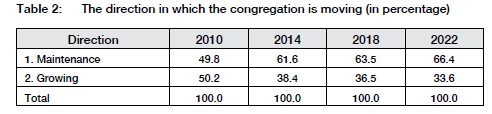 As part of the longitudinal empirical survey, congregations were asked if they were either growing or in a phase of decline. This question pertains to the direction in which a congregation is heading. The emphasis for the congregation might be on maintaining the current direction or position of the congregation. Congregations within a maintenance framework find growing challenging and are characterised by an inward, self-absorbed focus on ministry. The surveys asked about the direction into which the congregation was moving (see Table 2).