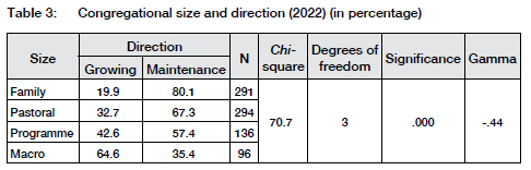 The maintenance orientation of congregations constantly increased from 49.8% in 2010 to 66.4% in 2022, and growing congregations decreased from 50.2% in 2010 to 33.6% in 2022. The relationship between the growth and size of a congregation is reported in Table 3.
