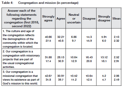 • Most congregations indicated that they have missionary projects as part of their congregational activities (statement 2) and view themselves as a missional congregation involved in God's mission to the world (statement 3).