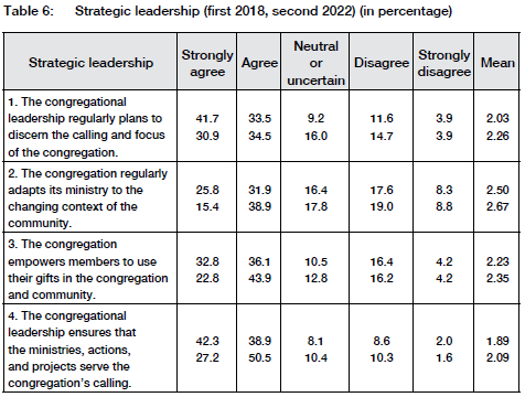 The congregational leadership plays a crucial role in shaping the focus and achieving the missional calling. Strategic leadership provides the direction and motivation for the congregation to accomplish its task and calling. Congregational leadership plays a crucial role in transforming the congregational culture within a changing context and is, therefore, of strategic importance. Table 6 describes the impact of the strategic leadership on the formation of a culture of discernment and imagination in the congregation: