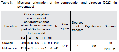 The vast majority of smaller congregations (family and pastoral) tend to focus less on a missional orientation, whereas larger congregations (programme and macro) are inclined towards a more missional orientation. The gamma value explains 27% of the variance in the table, and it also increased from 2018 to 2022. Growing congregations have a stronger focus on a missional orientation, whereas congregations that prioritise maintenance tend to have a lesser emphasis on the missional calling of the congregation (Table 8).