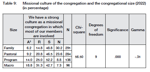 A significant indication is that larger congregations (programme and macro) tend towards growth, while smaller congregations (family and pastoral) emphasise maintenance within the congregation. These trends (Tables 2 and 3) point towards a greater inward focus rather than a culture of involvement and participation in society and the community's challenges. This held true for over 70% of the DRC congregations (see Table 1; family and pastoral congregations). The question, therefore, would be: What will unlock the cultural imagination of a congregation? Congregations need to evaluate the implications of their understanding of their identity and ask critical questions about their calling within their current context.