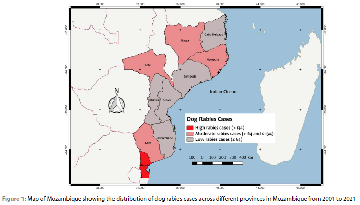 Figure 1 shows the map of Mozambique and provinces with animal rabies occurrences.