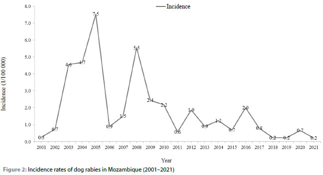 The high population density that accompanies rapid urbanisation and increases in the dog population, mainly in the suburban areas of the big cities such as Maputo and Nampula are major contributors to the occurrence of rabies in these regions (Salomao et al. 2017). In the suburban areas of these cities, there is also a lower educational level and a higher proportion of stray and unvaccinated dogs. In Maputo City, the notification of dog bite cases per inhabitant is the highest in the country (Salomao et al. 2017) but it is not clear if this merely reflects population density rather than any improved surveillance or reporting. Notwithstanding the human and dog ratio characteristic of some rural areas in African countries such as Zambia, Kenya and Mozambique (De Balogh et al. 1993; Kitala et al. 2001; Gsell et al. 2012; Mapatse 2021), the higher contribution of dogs to the occurrence of animal rabies should not be underestimated. As Maputo is the region where the largest veterinary diagnostic laboratory is located, it may also mean that the number of samples received from all corners of the country and tested at CVL is higher. In sub-Saharan countries, the growth in the dog populations is not accompanied by effective rabies control and prevention programmes (Kaare et al. 2009). This was seen in Mozambique, where the National Strategic Plan for Rabies Control was approved only in 2010 to fill such gaps. For provinces with lower occurrences of animal rabies cases, such as Zambézia, Sofala or Cabo Delgado, under-reporting and the lack of an effective disease notification system, particularly in remote (rural) areas, may be the cause of the low number of reported cases, especially in 2001 and 2002. This perception was also reported by Coetzer et al. (2017) and by Sabeta et al. (2021), who highlighted that in the 25 years from 1988 to 2012, laboratory detection of RABV in Mozambique was consistently hampered by limited sample submissions and lack of local diagnostic capacity. The contribution of other species, notably cattle, to overall animal rabies cases in some provinces of the country, such as Cabo Delgado, must be critically analysed because apart from suggesting spillover events, it may also mask the primary role of the dog in the maintenance of animal rabies cycle. Again, this arises from poor active surveillance to detect epidemiological events of lesser impact. Little is known about the involvement of wild carnivore species in rabies cycles in Mozambique. However, in rural areas, there are reports of wild carnivores such as jackals, mongooses, African wild dogs and hyenas showing typical symptoms of rabies (WHO 2013; Ministry of Health and Ministry of Agriculture and Rural Development 2019).