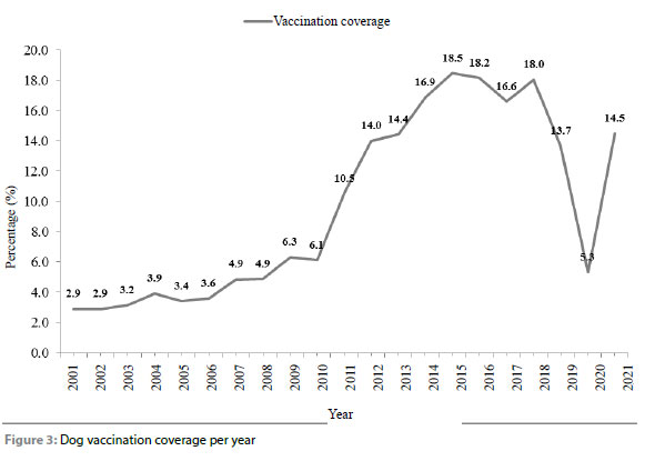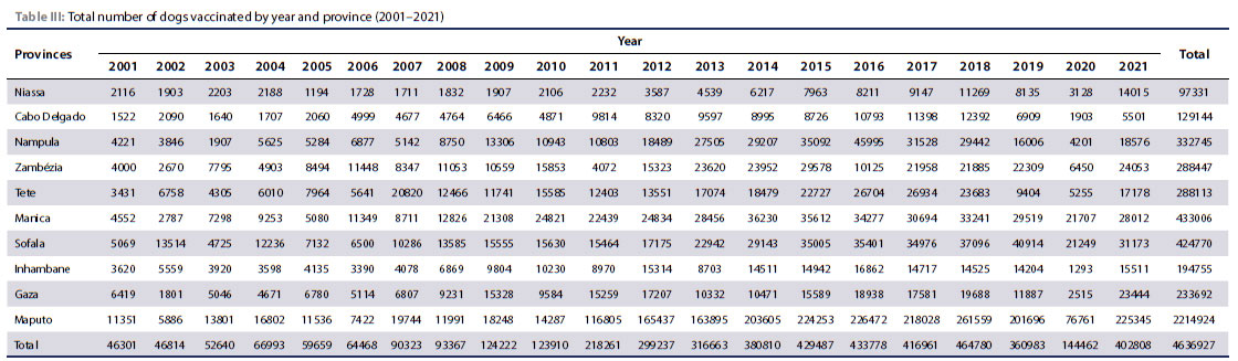 Table III illustrates the number of dogs vaccinated per year and provinces. During the period of study (2001-2021), approximately 4.6 million dogs were vaccinated, with the year 2018 having more vaccinated dogs (n = 464 780; 10%), while 2001 had less vaccinated dogs (n = 46 301; 1%).