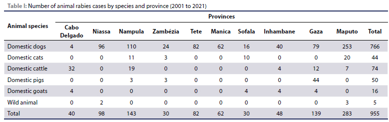 Current, official sources of rabies information, for example, repositories, articles and records, do not accurately reflect the true situation of the disease in Mozambique. Thus, our objective was to update and systematically organise and standardise epidemiological data on animal rabies and vaccination coverage in Mozambique over a period of 21 years (2001-2021). With this information, we would be in a better position to provide veterinary and health authorities with valuable information that can contribute to the improvement of on-going actions to end human dog-mediated rabies deaths by 2030.