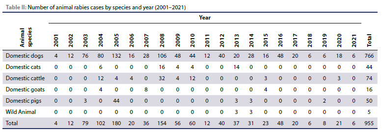 Table II shows the number of animal rabies cases by species and year. The annual mean was 45.5 with a range of four (in 2001) to 180 (2005). Most cases were confirmed in domestic dogs (n = 766; 80.2%), and the remainder in domestic cattle (n = 74; 7.7%), domestic pigs (n = 50; 5.2%), domestic cats (n = 44; 4.6%), goats (n = 16; 1.7%) and five cases in unspecified wild animal species (0.5%). The highest occurrence in domestic dogs was observed in 2005 (n = 132; 13.8%). The total number of animal rabies cases covering a 21-year period (2001-2021 decreased on average by approximately 3.17 cases each year (p = 0.065). Since 2010, there has been a downward trend in the proportion of animal rabies cases (p = 0.023).