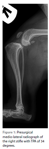 The stifle joint was inspected, and the remnants of CCL debrided, to allow visual inspection of the medial meniscus. There was partial-thickness cartilage erosion over the medial trochlear ridge with no other signs of degenerative joint disease. The trochlear groove was shallow and could only accommodate about 30% of the depth of the patella (DeCamp 2015). No medial meniscal injury could be identified. The joint was flushed with lactated Ringer's solution. A needle was placed into the joint in the region of the medial collateral ligament, perpendicular to the long axis of the bone in order to identify the joint surface of the tibia. A 2 mm locking TPLO (Veterinary Instrumentation, Sheffield, United Kingdom) plate was placed as caudal as possible on the proximal tibia to create enough space cranial for an appropriately sized TT osteotomy in order to test if the plate would fit. The infrapatellar fat pad was sharply incised with a no. 11 scalpel blade from proximal to distal to delineate the line for the osteotome placement caudal to the insertion of the patella tendon on the TT just cranial to the cranial edge of the extensor tendons sulcus. The TT osteotomy was performed, and the fragment was elevated and moved out of the way. A bone file was used to smooth the osteotomy surface. Next, two guide K-wires (1.1 mm) (Veterinary Instrumentation, Sheffield, United Kingdom) were placed perpendicular to the long axis of the bone. One pin at the most caudal-proximal aspect of the tibia/tibial plateau and the other one centrally in the distal diaphysis of the tibia. These two guide pins were lined up along the long axis of the tibia (parallel in the cranio-caudal view and overlapping along the length of the tibia if visualised from distal to proximal). The intended osteotomy lines were drawn with monopolar electrocautery. The initial osteotomy (horizontal line) was executed from cranial to caudal and perpendicular to the long axis of the tibia, starting at the most distal aspect of the TT. The subsequent step involved creating a 34-degree diagonal line from cranio-proximal tibia to caudo-distal, intersecting the horizontal line two-thirds of the way caudally. This was drawn with the use of a 34-degree surgical triangle guide (Veterinary Instrumentation, Sheffield, United Kingdom).