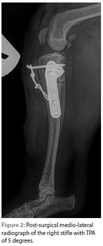 The patient was discharged four days postoperatively with meloxicam (0.1 mg/kg PO q 24 hours, Petcam, Cipla Medpro, Bellville, South Africa) for three days and strict instructions of confinement for six weeks in a recovery crate. On discharge leash walking was advised four to five times a day for 10 minutes per session. The patient had good range of motion, mild soft tissue swelling around the surgical site and a grade 3/5 lameness.