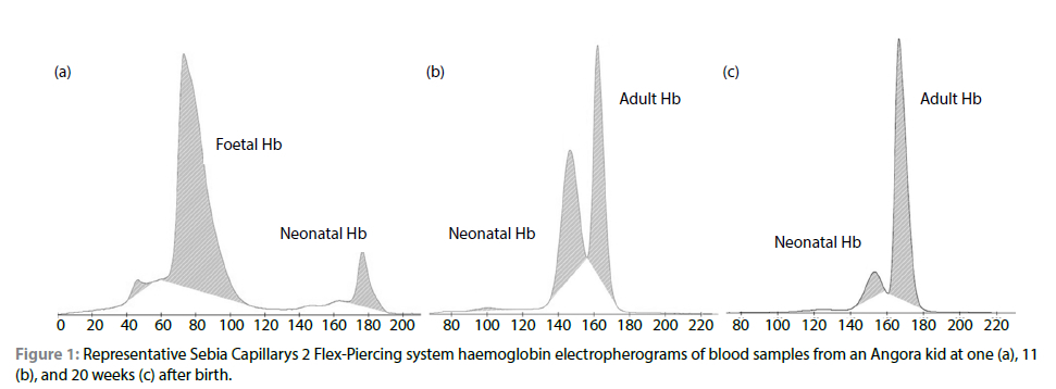 A limitation to the further investigation of this hypothesis is the lack of standardised or validated indirect chromatographic or electrophoretic assays for the quantification of caprine Hb variants. Few published studies have confirmed the validity of these methods when compared to definitive Hb protein analysis, and noteworthy amongst these are studies that were undertaken in the 1960s using DEAE-Sephadex chromatography, which showed that the mobility of foetal Hb was distinct from that of the more similar neonatal and adult variants (Huisman et al. 1967; Huisman et al. 1969). Capillary electrophoresis (CE) has recently become widely used for routine identification of human Hbs (Riou et al. 2018) and this study aimed to investigate the utility of a commercial automated human Hb CE system, the Capillarys Hemoglobin(E) kit used with the Capillarys 2 Flex-Piercing (C2FP) instrument (Sebia, Lisses, France), for the quantification of the major non-allelic caprine beta chain Hb variants.