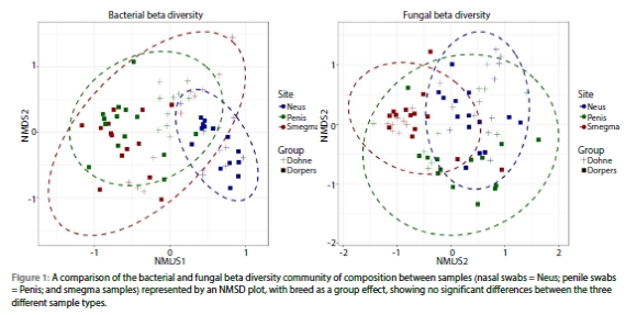 Figure 1 represent non-metric multidimensional scaling (NMSD) ordination plots of the bacterial and fungal beta diversities for the comparison of community compositions between the three different sample types. No significant differences were observed between the three different sample types (nasal swab, penile swab, and smegma) for the bacterial or fungi indexes, irrespective of the presence of disease (Figure 1).