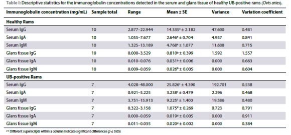 In the current study, immunoglobulin concentrations (i.e. IgG, IgA, and IgM) were determined in serum and tissue samples collected from healthy rams (i.e. not affected by UB), and rams affected by UB. No literature could be found on the immunoglobulin profile of the lower reproductive tract of rams, suggesting that the current study, therefore, presents novel information in this regard. The immunoglobulin levels reported for the serum and glans tissue samples in the current study will therefore be used as reference values to contextualise and discuss the immunoglobulin levels detected in the UB affected rams (Table I).