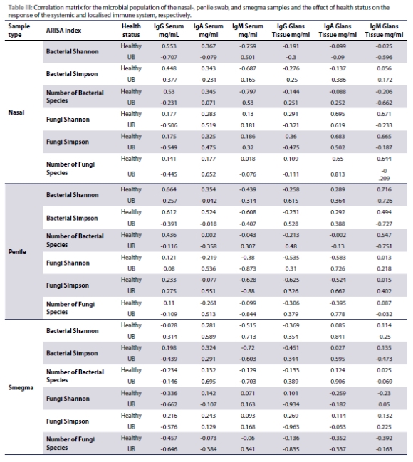 Based on the microbial responses observed in healthy and diseased rams, further investigation was conducted to explore the correlation between changes in the natural microbiome and the immunoglobulin profile. The study revealed several associations: serum and glans tissue IgA levels increased with higher bacterial species numbers in UB-infected animals, while serum IgM decreased with increased bacterial species in smegma. UB infection correlated with increased glans tissue IgG with higher penile bacterial diversity, yet decreased glans tissue IgM with greater bacterial richness and evenness. The penile Simpson index showed that serum IgG, IgA, and IgM decreases with an increasing Simpson index caused by UB. The correlations between this index and the IgG and IgM of the glans tissue suggests that both tissue IgG and IgM increases with the increase of the Simpson index, once infected with UB. Nasal fungal Shannon indexes showed that higher fungal species richness and evenness correlated with increased serum IgA and IgM, decreased glans tissue IgG, and slightly increased glans tissue IgA and IgM, indicative of disease.
