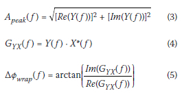 Python signal processing code was also developed to analyse the SASW test data and is available in Islam (2022). The signal processing included analysis of the spectral amplitude, coherence, and phase difference. Domain transformation from time to frequency was again done, which allowed the spectral amplitude to be calculated for each geophone. The wrapped phase difference was calculated using the cross-power spectrum of the two geophones. Equations 3 to 5 were used to calculate the respective functions.