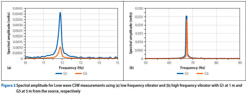 The evaluation of vibrator performance was conducted by plotting the spectral amplitudes of the geophone signals (Figure 2). The results indicate that the peak frequencies obtained from both geophone 1 (closest to the source) and geophone 5 (farthest from the source) were similar. By analysing the spectral amplitude plots, the frequency required for calculating the Love wave velocity, VL, was determined.