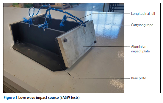 The SASW tests utilised three sledgehammers (respectively with a mass of 2 kg, 6 kg and 9 kg) to produce seismic energy across different frequencies. The mass of the impact source influenced the generated energy content, resulting in varying frequency ranges for the distributed energy. A trigger switch on each sledgehammer facilitated the acquisition process upon impact.