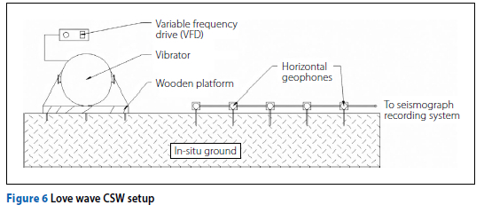 The conventional CSW test utilises frequency-controlled vibrators to generate steady-state Rayleigh waves along the ground, while an array of vertical geo-phones detects the surface wave motion (Menzies & Matthews 1996). The vibrator is stepped through a set of frequencies to generate a range of wavelengths. Electromagnetic vibrators, controlled by a signal generator and power amplifier, as well as mechanical vibrators driven by an electrical motor and controlled by a variable frequency drive, have been employed (Heymann 2013). Both types of vibrators can also generate transient signals that sweep through a range of frequencies within a specified time.