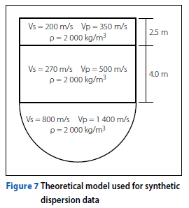 A theoretical approach using synthetic Rayleigh and Love wave dispersion data was used to compare the discrete and joint inversion approaches. A theoretical model with two layers and a half-space layer, with properties as shown in Figure 7, was used to generate synthetic dispersion data. The forward calculation for the Rayleigh and Love models was calculated using the formulation of Wathelet (2005) and is available as the gpdc package, which is part of the Geopsy software suite of open-source software for geophysical research. The forward calculation formulation is based on the eigenvalue problem described by Thomson (1950) and Haskell (1953), subsequently modified by Knopoff (1964), Dunkin (1965) and Herrmann (1994). The values of the shear wave velocity (Vs) and compression wave velocity (Vp) were chosen to give a normally dispersive profile with a Poisson's ratio close to 0.25, which is typical for soils above the water table. Karray and Lefebvre (2008) have shown that the choice of Poisson's ratio affects both the calculation of synthetic data and inversion analysis of dispersion data, and hence, for consistency, a constant Poisson's ratio was used to calculate the synthetic dispersion data. Random noise was superimposed on some of the synthetic dispersion data to investigate the effect of the quality of the dispersion data on the performance of the inversion strategies.