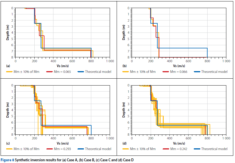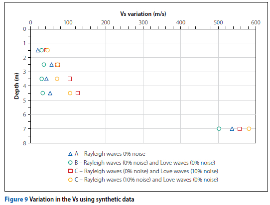 Figure 9 shows that, in general, a joint inversion incorporating good quality Rayleigh and Love wave dispersion data (Case B) produced a smaller Vs variation than a discrete inversion analysis using only Rayleigh wave data (Case A). This was observed for four out of the five cases. Upon the addition of noise, the quality of the inversion results deteriorated. For all depths the Vs variation was greater for both Case C and Case D (10% noise for either Rayleigh or Love wave data) than that obtained from Case A and Case B (0% noise). Thus, the quality of the dispersion data significantly affected the inversion process and reduced the ability to accurately estimate the theoretical Vs profile.