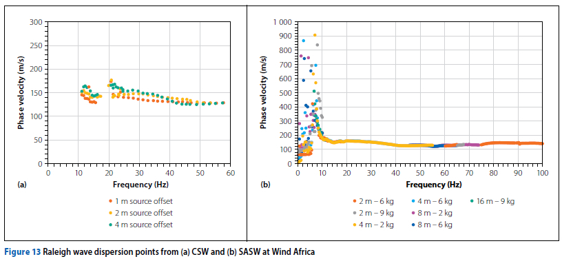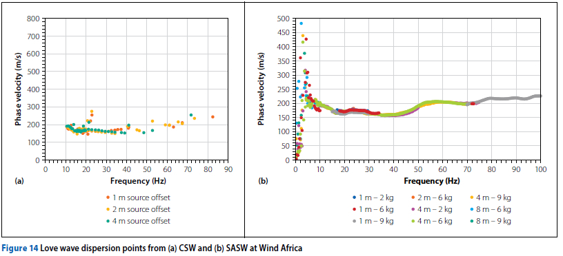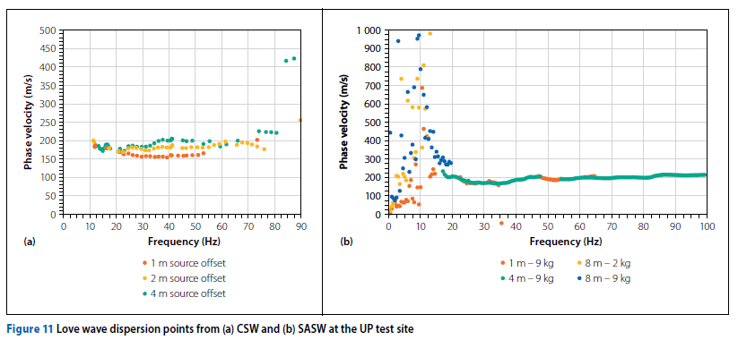 Acceptable data was selected through the evaluation of the spectral amplitude plot, the wrapped phase difference plot, and the coherence function. The selection process is commonly referred to as 'masking' of the data. A coherence criterion (γ2 > 0.9) was applied to the results to identify frequency regions with high signal quality (Nazarian & Stokoe 1986). Upon unwrapping the phase difference, the phase velocity at each respective frequency was calculated using Equation 6, and dispersion curves were constructed. A final composite dispersion curve was assembled by merging each of the individual dispersion curves measured for each test configuration.