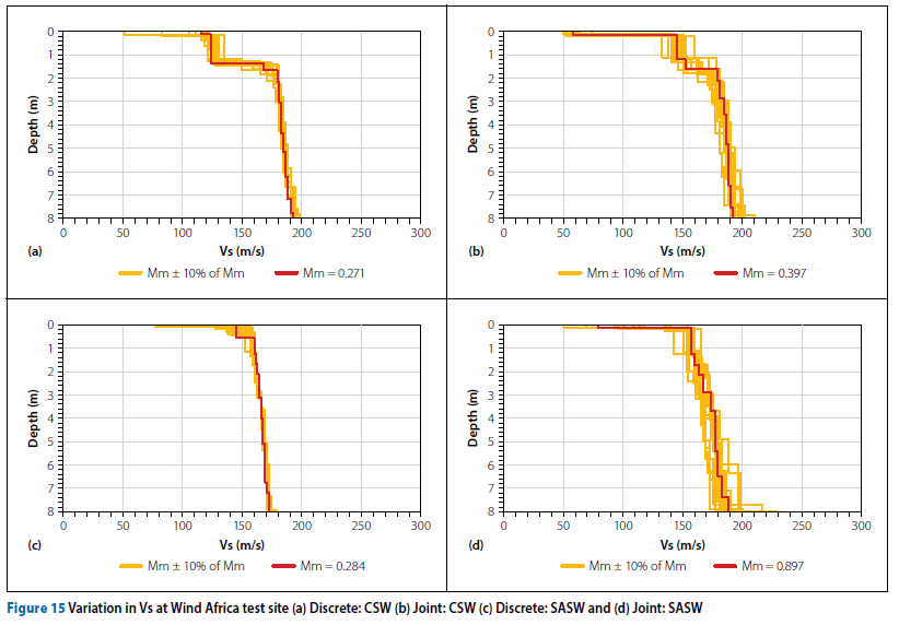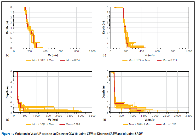 The variation in the Vs was again calculated by considering the upper-bound and lower-bound Vs profiles within the limits of Mm ±10% of Mm. The variations in the Vs for the discrete and joint inversions using CSW and SASW tests respectively are shown in Figure 15.