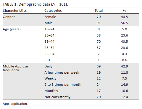 A total of 161 valid responses from the initial 168 were analysed, after 7 responses did not meet the validity test. Majority of the respondents 56.5% (91) were males, while 43.5% (70) were female, and 43.0% of respondents were between the age group of 35 and 44 years, and only one respondent was over the age of 65. Table 1 provides a summary of the demographic data of the sample, showing the age and frequency of use of mobile phones.