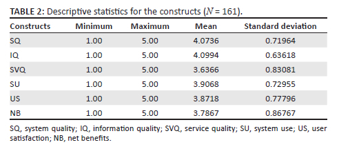 Table 2 provides descriptive statistics for the six constructs of the research model (DeLone & McLean 2003). The mean scores for the constructs ranged from 3.6366 to 4.0994, with SVQ having the lowest mean score (Mean = 3.6366, Standard Deviation = 0.83081). The results suggest that those who participated in the survey agreed that the m-commerce application for the telecommunication company was of good quality, useful, and satisfactory, and there are benefits associated with using it.