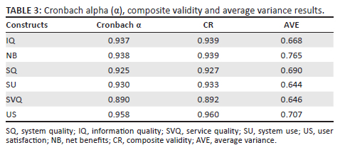 Table 3 presents measures for the internal consistency of the model, with composite validity (CR) and Cronbach's alpha (α) above 0.7, which meets the recommendations of Pallant (2020). The convergent validity test produced values for extracted average variance (AVE) greater than 0.50, above an acceptable threshold value of 0.5 (Ravand & Baghei 2016). Furthermore, the factor loading of each item was also examined to evaluate the convergent validity of the measurement model. Cross-loading results were greater than 0.7, which met the recommended criteria (Hussein & Baharudin 2017). Because of page limitations, the results of factor loadings are not presented in this article.