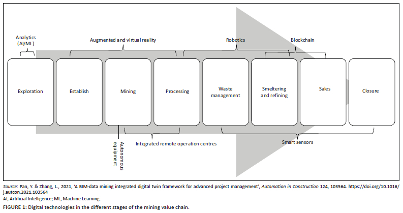 According to Lehmann (2021), project management can be described as the application of processes, methods, skills, knowledge and experience to achieve defined project objectives based on project acceptance criteria within agreed parameters. The final deliverables of project management are constrained by a finite timescale and budget. According to Sarc et al. (2019), digital project management refers to a streamlined process of managing projects using digital technologies. Digital project management starts with the concept and ends with the total project completion within the defined budget and using the allocated amount of resources (Sarc et al. 2019). Figure 1 depicts how modern digital technologies have impacted and will continue to impact different areas of business in the mining sector.