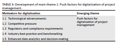 According to Guo and Zhang (2022), push factors refer to the external factors or stimuli that compel or motivate individuals, organisations or industries to adopt or pursue a particular course of action, such as the digitalisation of project management. Table 3 shows the development of the first emerging main theme: push factors for the digitalisation of project management.