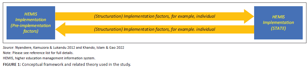 The research draws from the structuration theory to formulate the conceptual framework that is applied in the study. Figure 1 shows the conceptual framework. Structuration theory has the ability to examine action and interaction variables (Nyandiere, Kamuzora & Lukandu 2012; Orlikowski & Scott 2008). It is able to provide the study with a comprehensive outlook and insight on HEMIS pre-implementation factors as suggested by Stillman (2006) and Yin, Wang and Liang (2023). It has been used in IS research by Khando, Islam and Gao (2022) and Nyandiere, Kamuzora and Lukandu (2012) to investigate ISs implementation and related factors in similar cases.