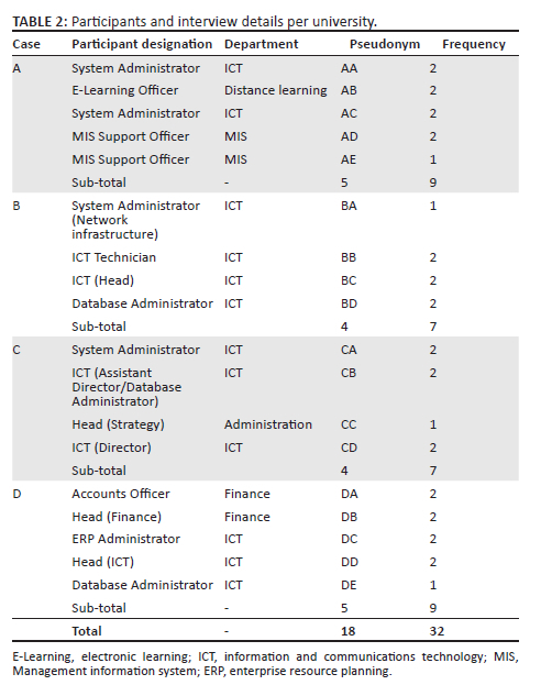 After the cases were identified, requests to formally undertake the study were sent out using letters and emails to the institutions through their gatekeepers. After receiving the necessary consent to undertake the study, introductory visits to the institutions were organised through the university gate keepers, Vice Chancellors' (VCs) offices, through which participants were subsequently identified to participate in the study. For instance, in Case A, a letter was written to the in-charge, the VC of the university, for permission to undertake the study. The matter was referred to the Deputy Vice Chancellor (DVC) (Partnerships, Research and Innovation) who facilitated access to the IT and IS departments.