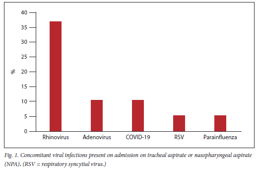There were three possible concomitant BSIs identified <48 hours of PICU admission. One patient had confirmed Escherichia coli (E.coli) bacteraemia. There were two other positive blood cultures - one with a micrococcus and one with coagulase-negative staphylococcus, which were considered contaminants and were not treated.[24] Of the confirmed viral infections on tracheal or nasopharyngeal aspirates <48 hours of admission to PICU, human rhinovirus was most commonly identified (n=7, 36.8%) (Fig. 1). There was one case with a confirmed E. coli urine infection and one child had meningitis with Gram-positive and Gram-negative organisms on cerebrospinal fluid Gram stain, but no growth on culture.