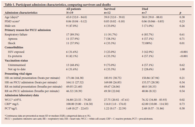 RESULTS: There were 1 273 PICU admissions during the study period, of which 101 (7.9%) were tested and 19 (1.5%) tested positive for B. pertussis. Of those, 13 (68.4%) were completely unimmunised, mainly owing to young age (n=9). The median (interquartile range) total duration of ventilation was 7.0 (3.0 - 21.0) days, with a maximum of 35 days. Mortality was 36.8% (n=7) in those with B. pertussis; with more deaths in HIV-exposed patients (n=3/7,42.9% v. n=3/12, 25%; p<0.001) and preterm infants (n=4/7,57.1% v. n=4/12, 33.3%; p<0.001), as well as those with septic shock (n=7/7, 100% v. n=4/7, 33.3%; p = 0.02) and acute kidney injury (n=6/7, 85.7% v. n=2/12, 16.7%; p<0.001). The maximum white cell count was significantly lower in survivors (27.75 v. 76.32; p<0.001). None of the variables was independently associated with mortality on multivariable regression